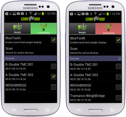 The applications connection status to a Chek-Way system is indicated by the displayed colour of the connection tab, green for a connection and red for no connection. This is another way Phone-Way helps to reduce errors.